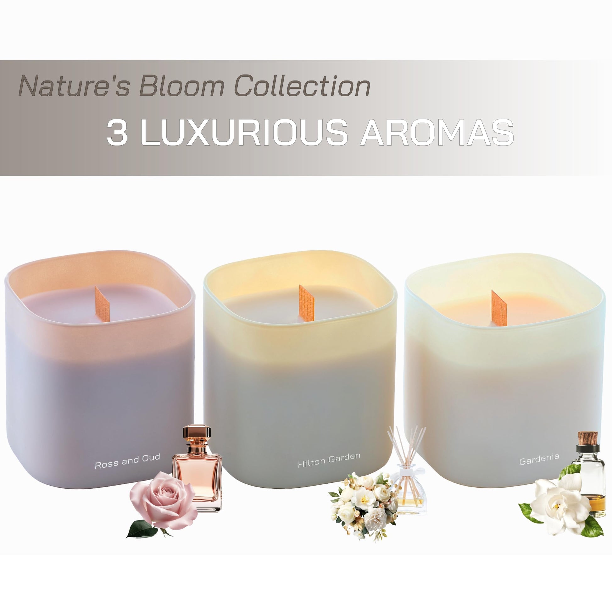 Set of 3 Scented Soy Candles Gift Set | Nature's Bloom Collection | 3 Scented Candles - Gardenia, Hilton Garden, and Rose & Oud | Crackling Wood Wick | Clean Burn | 50+HR Burn Time, 9.8oz Each