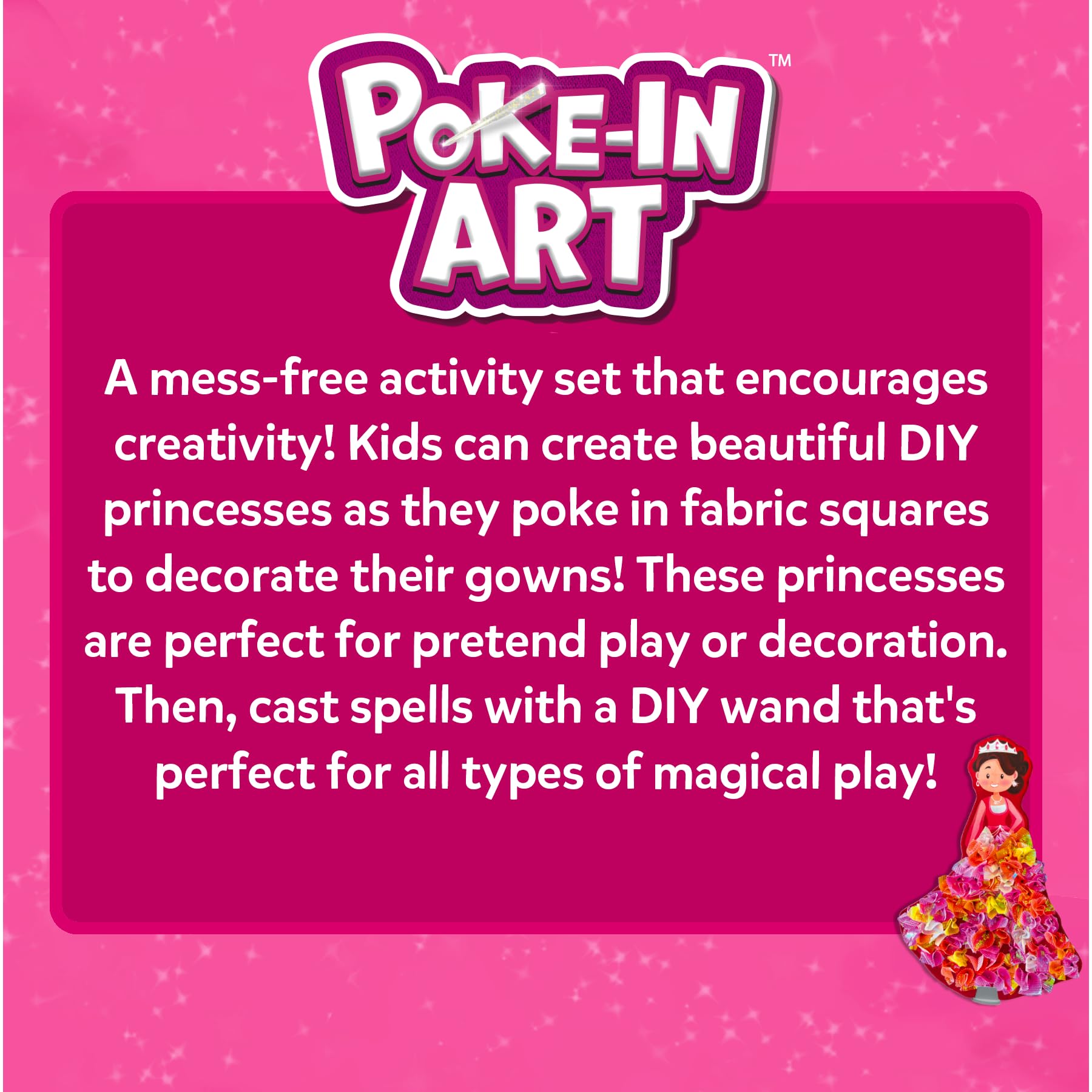 - POKE-IN ART ACTIVITY: This mess-free craft activity encourages creativity! Kids can create beautiful DIY princesses using fabric squares that are poked into foam to decorate their gowns. Then, they can craft their very own DIY wand and cast spells for all types of magical play!