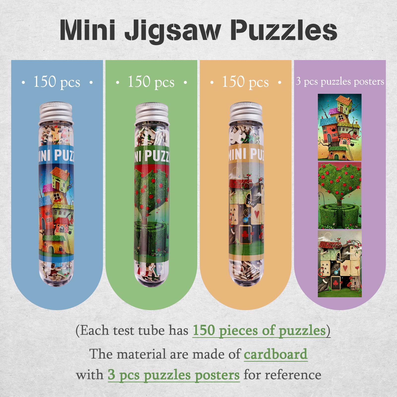 - Jigsaw puzzles 150 pieces -- puzzles for adults are include 3 pcs separate test tube packaging, each puzzle with 150 pieces. Each pieces puzzles smaller than your finger. This set of jigsaw puzzle completed size: 6 x 4 in/15 x 10 cm (Not including frame).