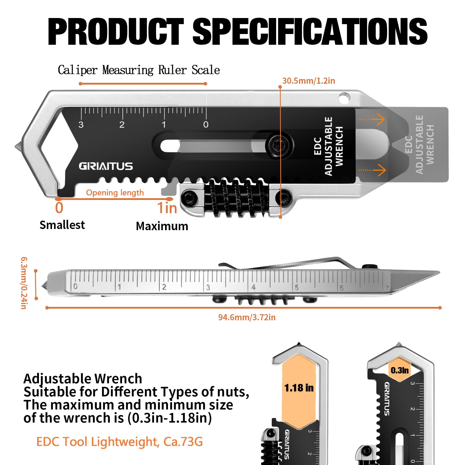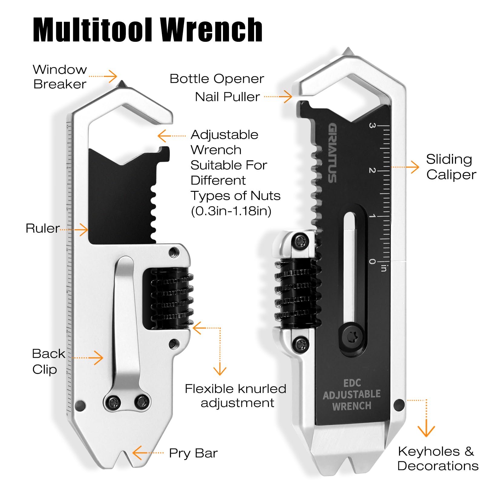 - Versatile Functionality: This compact multitool wrench spanner combines a wrench, with knurled adjustment design, mini pry tool nail remover, bottle opener, and caliper, pocket clip, quick adjust ensuring you're prepared for any task