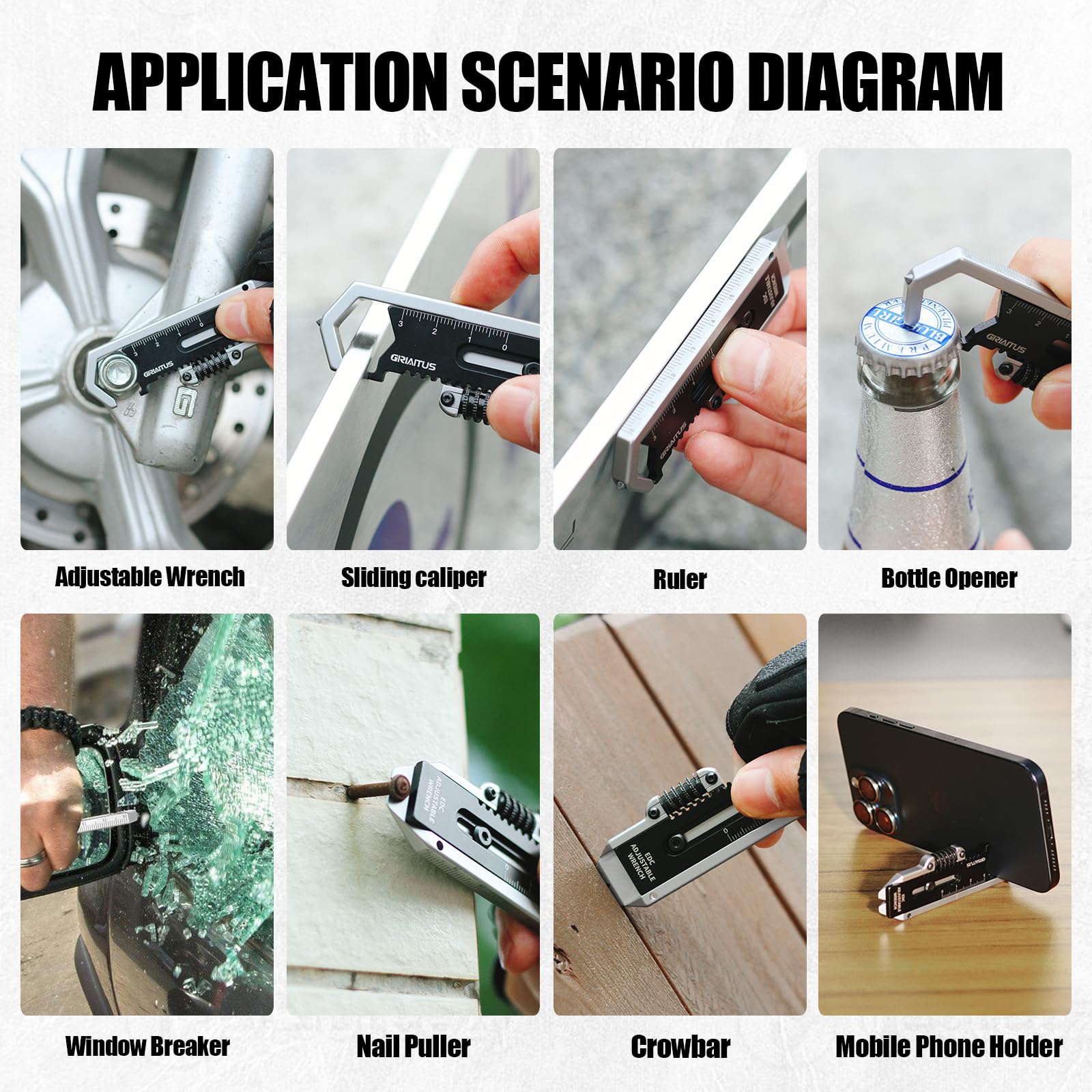 Small Multitool Wrench 9 in 1 Pocket Adjustable Wrench for Screw with Mini Pry Bar Nail Puller Keychain Tool Caliper Measuring Ruler Glass Breaker EDC Gadget Survival Gear for Men Cycling Hiking