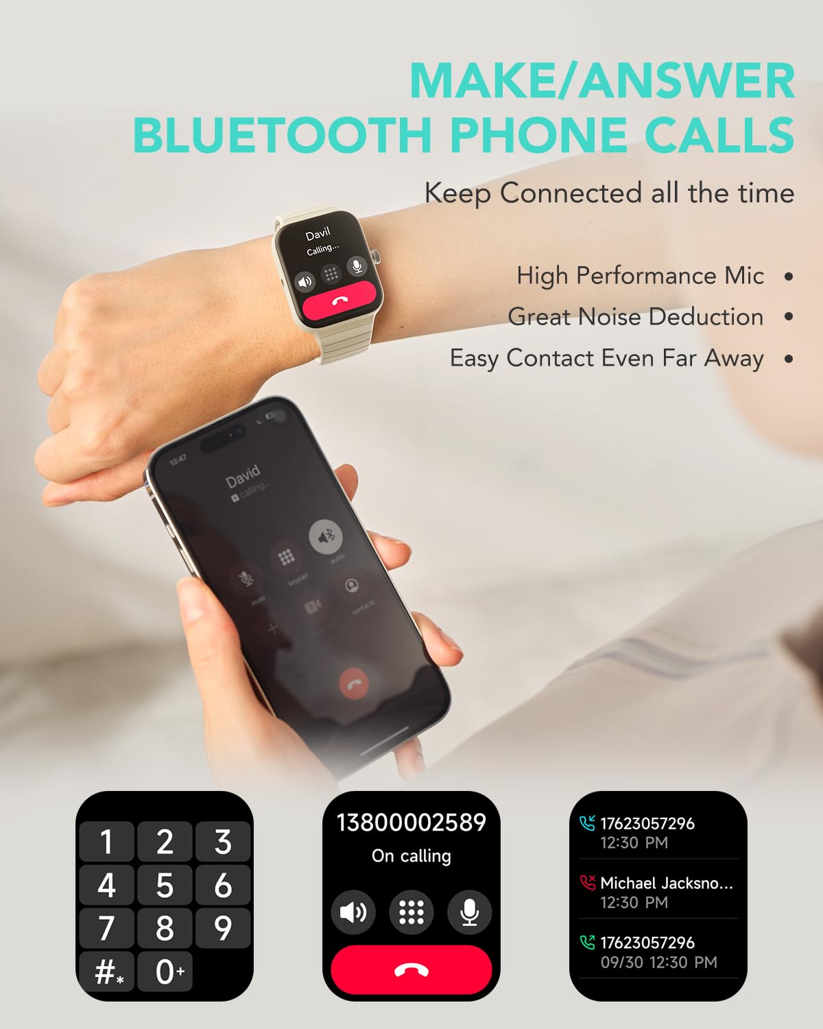 - MULTIFUCTIONAL DAILY WATCH Once connected within bluetooth range (8-10 meters), enabled notification both on the watch and phone, this smart watch wiil provide smart notifications of the phone calls, text, SNS app messages ( NOTE:THE WATCH CANNOT MESSAGE OR TEXT BACK), and offer many reminders: drinking and hand wash reminder, women's health reminder, etc, this watch also can be used to realize weather display, music control, stopwatch, alarm clock to meet your daily needs
