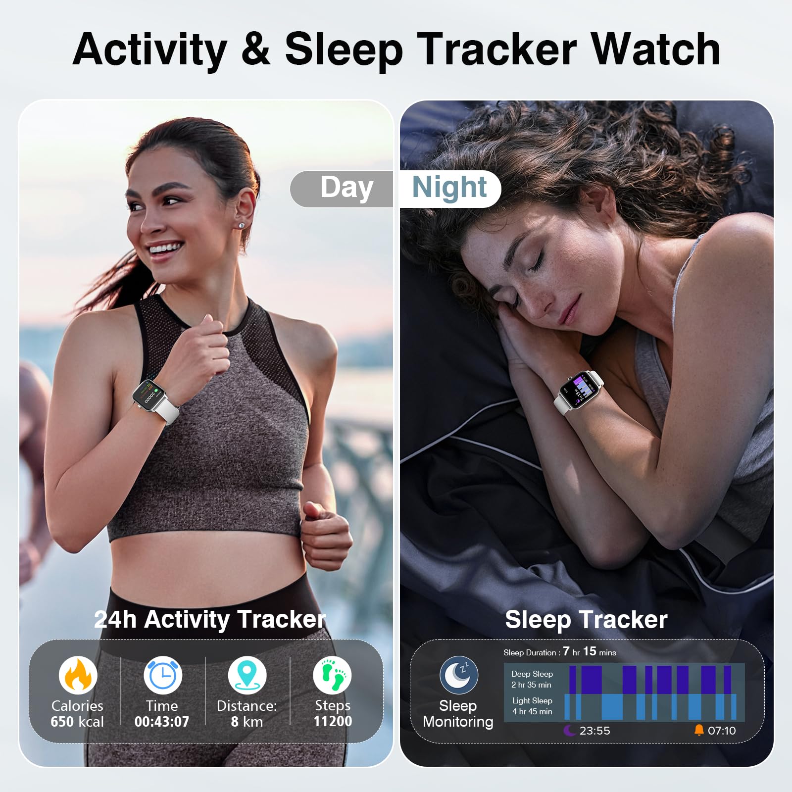 - 【24/7 Health Monitor and Sleep Tracker】:Smart watch for android phones /iphone equiped with high-performance optical sensors, continuously recording your daily walking steps, distances, calories, and monitoring your heart rate, SpO2, stress level, and sleep status (deep sleep, light sleep,wakefulness); More features, such as sedentary reminders and water drinking reminders;Non-medical use