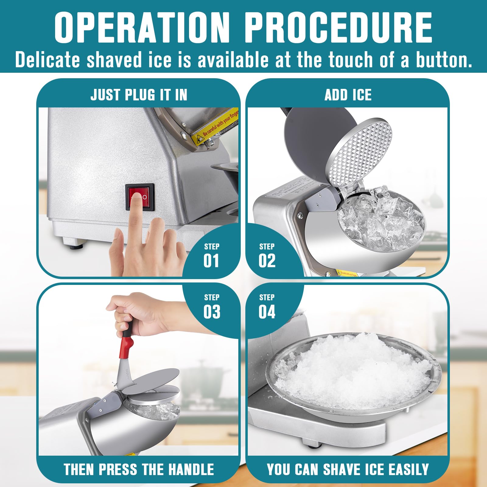 - Stainless Steel 4-Blade Head: The Stainless Steel Shaved Ice Machine is equipped with a stainless steel 4-blade head, which can easily deliver fine, smooth ice cubes. Powered by a 300W motor, the Electric Ice Shaver can crush up to 220 pounds of ice per hour, meeting the high-capacity needs of parties, events or commercial use in the shortest time