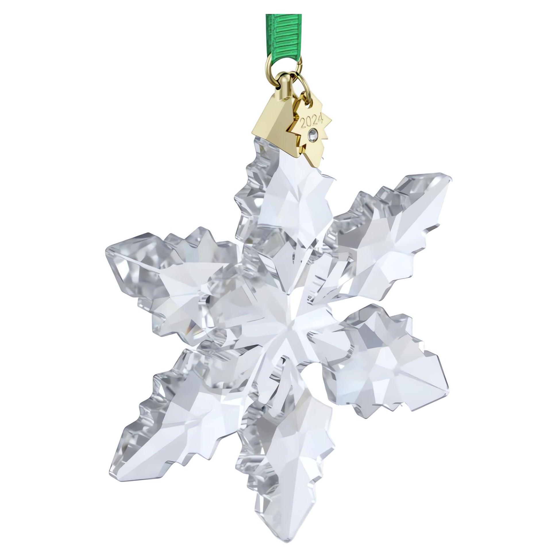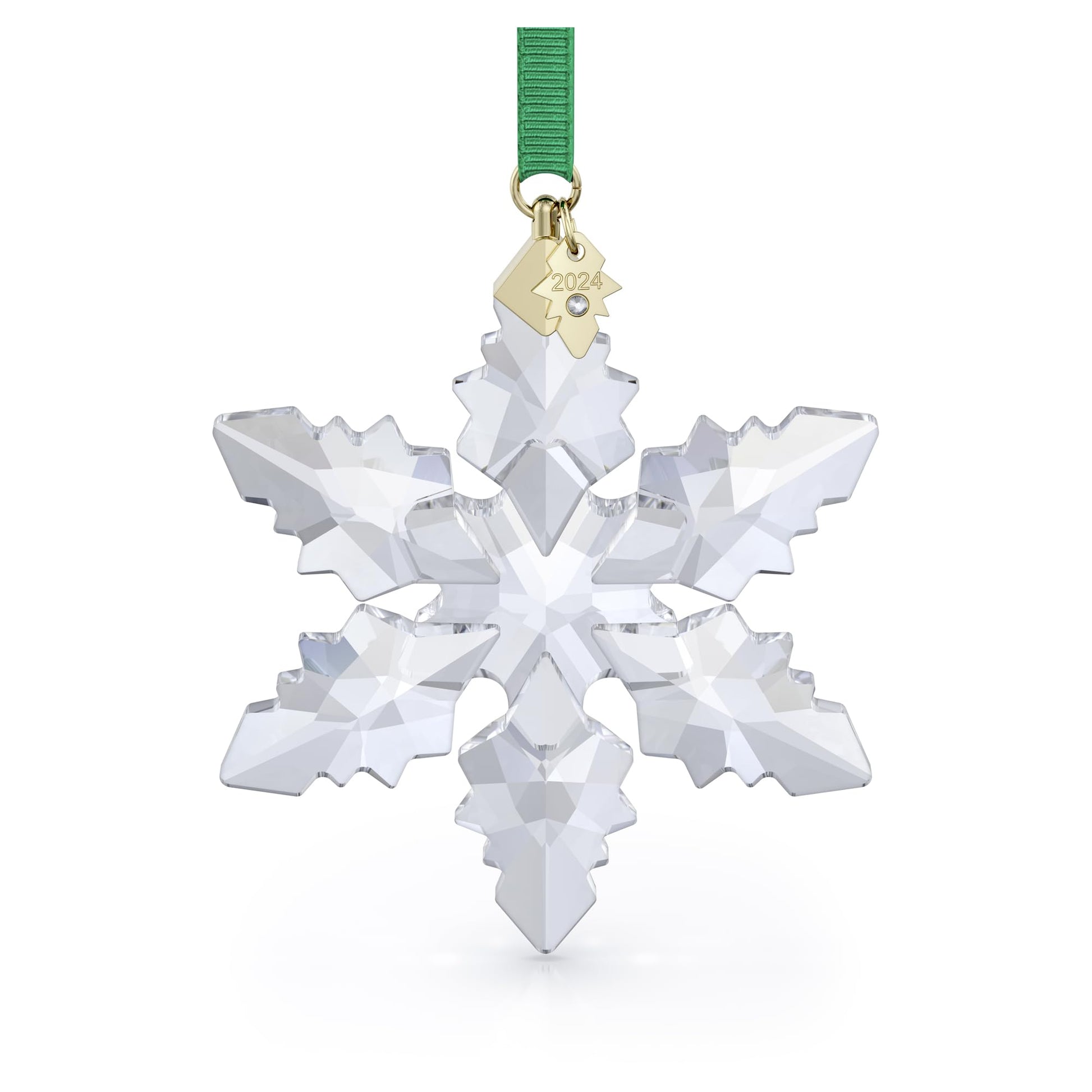 - Items Delivered: (1) Swarovski Annual Edition 2024 snowflake ornament with clear faceted crystal, gold-tone metal accents, and green rayon ribbon; complete with Swarovski keepsake box