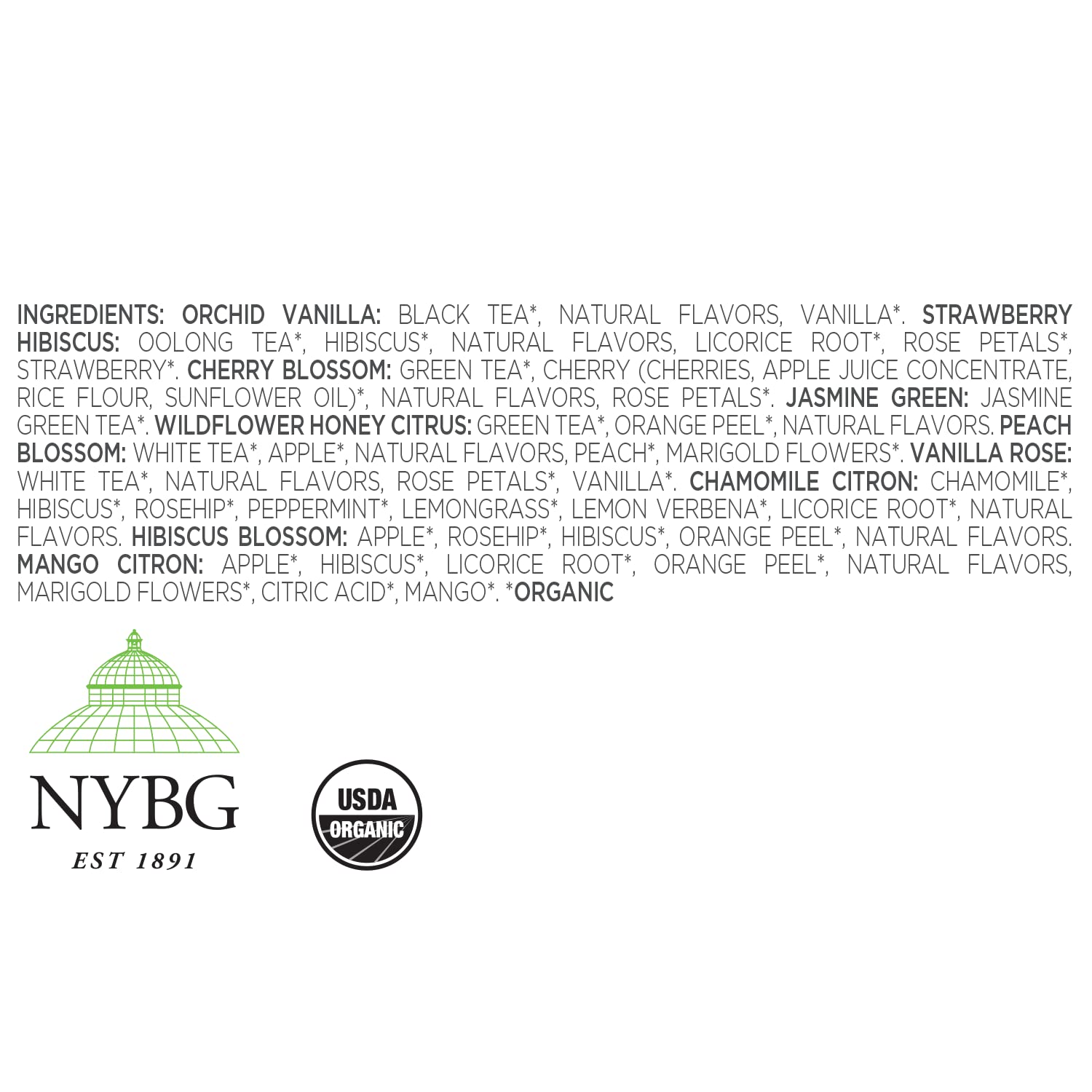- TEA BAG ASSORTMENT with 10 flavors, 2 of each, Including: Orchid Vanilla, Ginger Lemon, Cherry Blossom, Wildflower Honey Citrus, Peach Blossom, Vanilla Rose, Jasmine Green, Chamomile Citron, Hibiscus Blossom, Mango Citron.