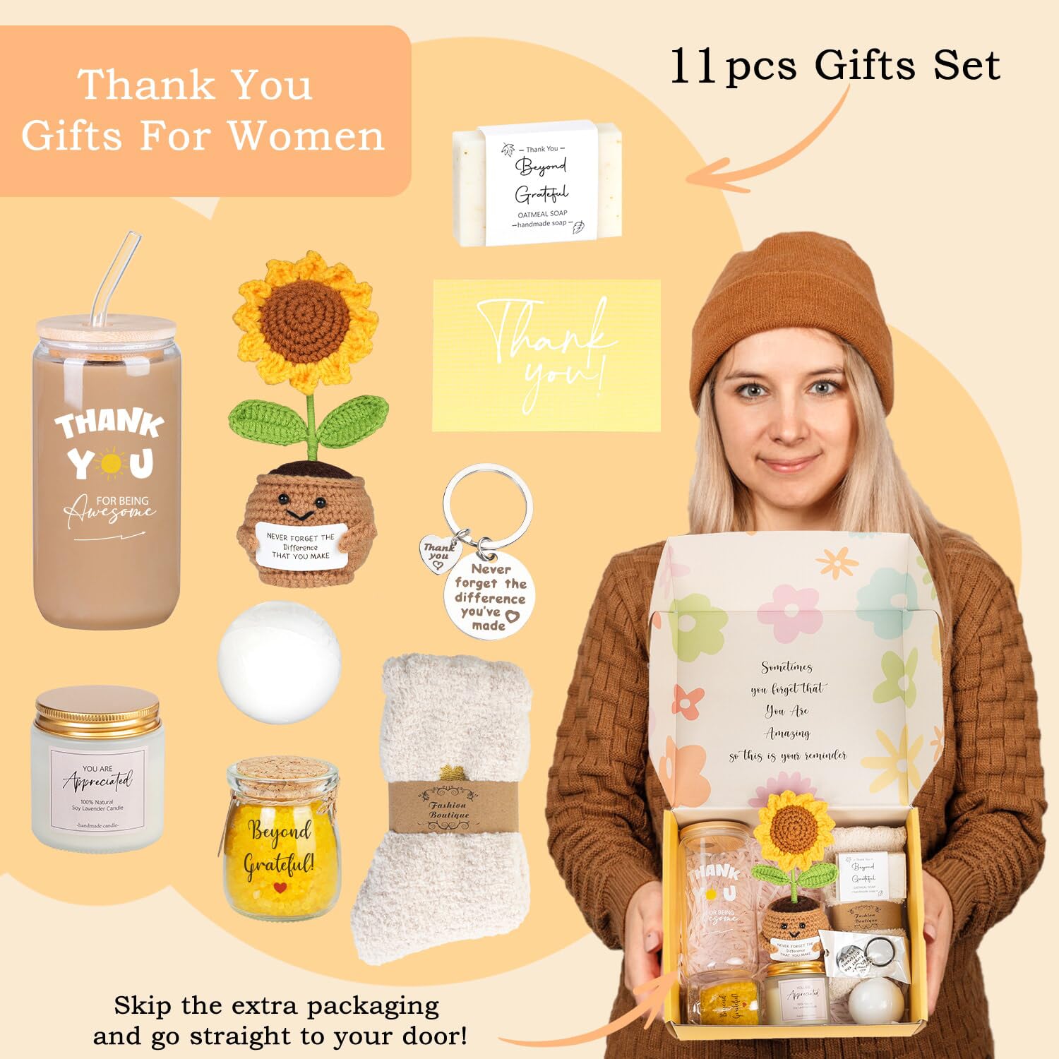 - All-in-One Thank You Gift Box: This meticulously crafted thank you gift box is a symphony of thoughtfulness and care, designed to offer a complete sensory experience that appreciates the special people in your life. This thank you gift basket includes an appreciated candle, bath salt ball, furry sleep socks, thank you cup, appreciation keychain, handmade bar soap, handmade crochet sunflower, and a thank you card.