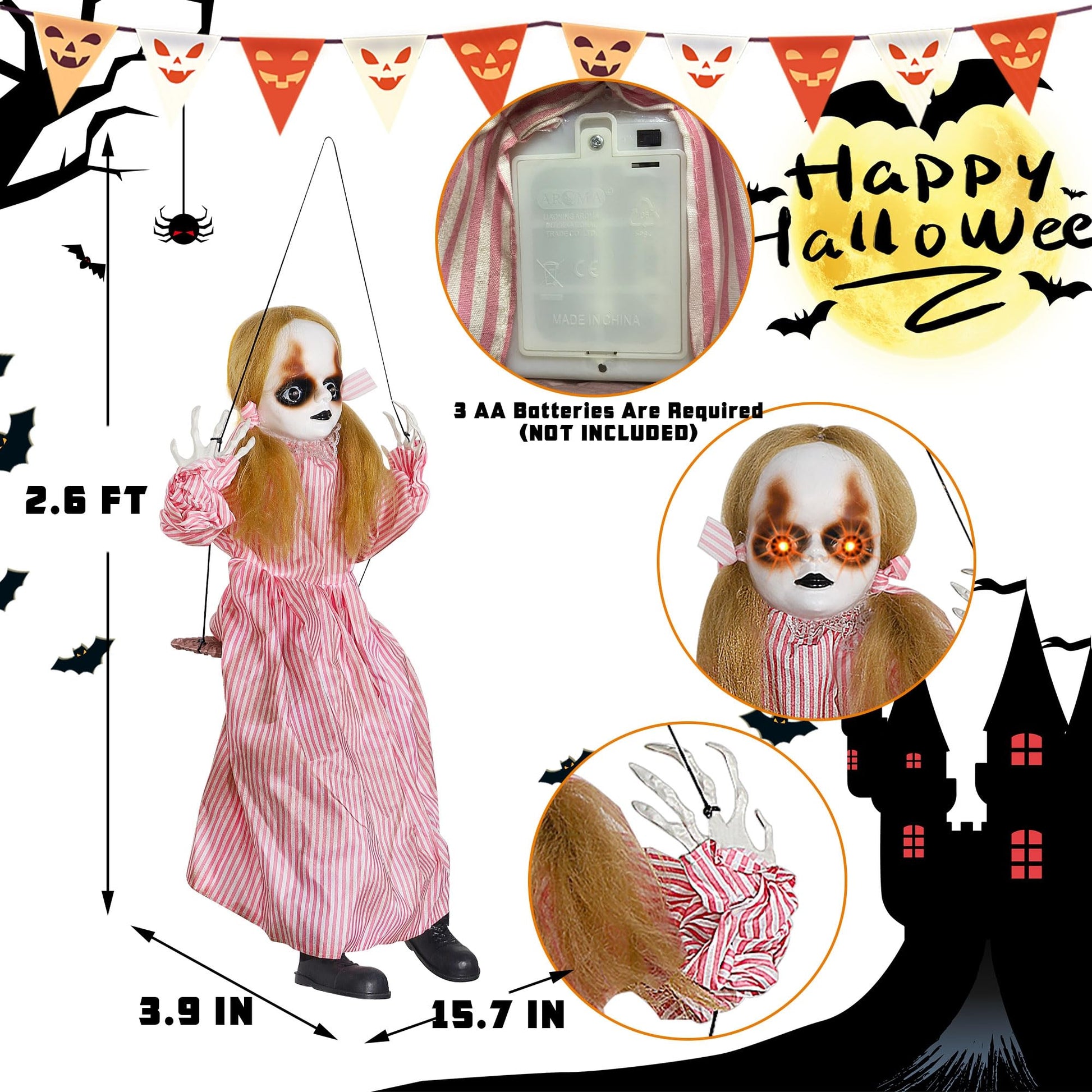 - LIGHTED EYES & EERIE SOUND: Once activated, girl's eyes will glow yellow lights, and meanwhile, you will hear creepy sounds of laughing, singing, whispering and inviting emitting from the prop. The weird and frightening sound wandering in the room not only upgrades the terror but would definitely leave great impressions.