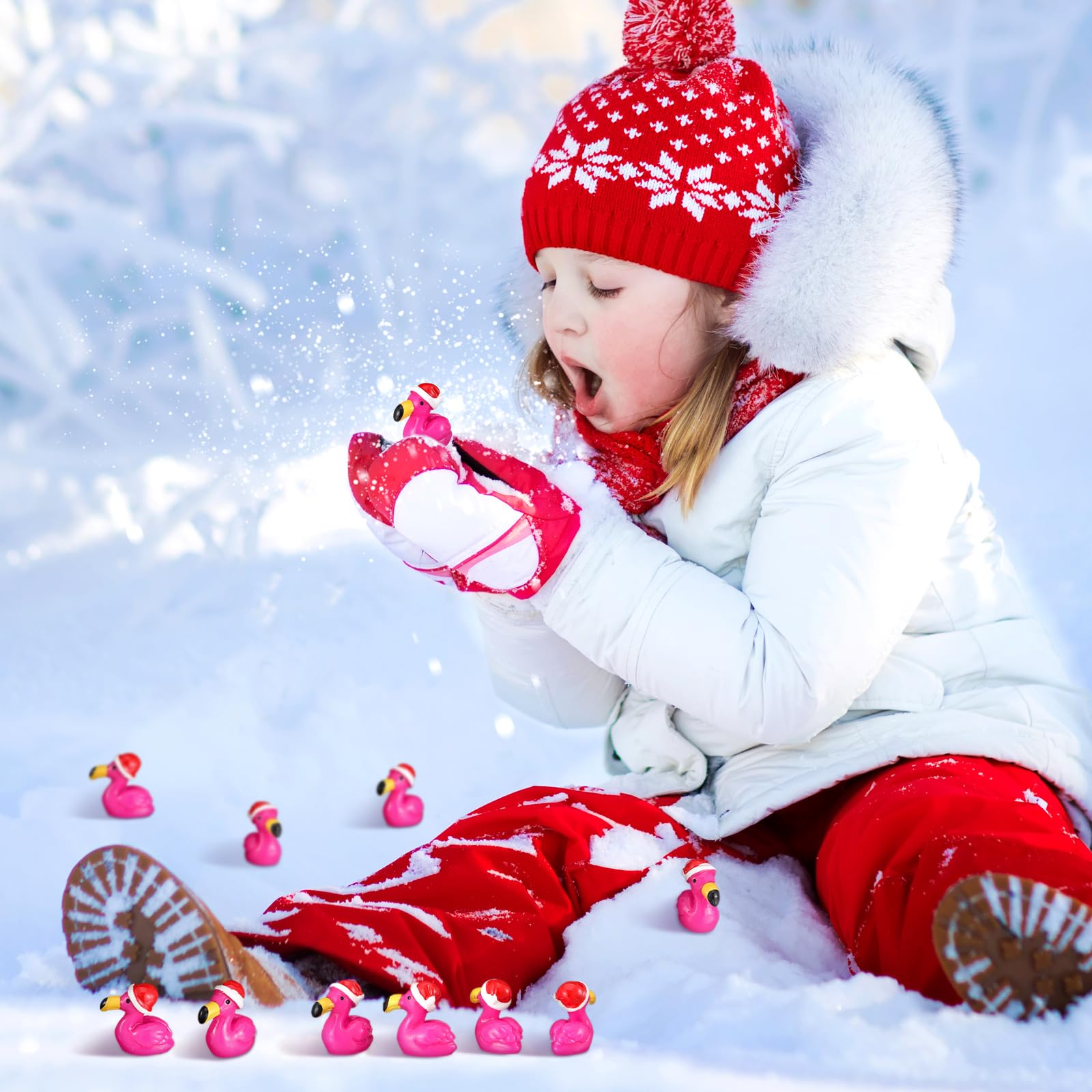 - Cute Size: each christmas flamingo figurine about 0.87 x 0.83 inch/ 2.2 x 2.1 cm, these flamingo tiny ducks are the ideal size for imaginative decoration; Whether creating a whimsical garden scene or a festive indoor display, their compact size makes them fit for hiding in unexpected places, sparking delight