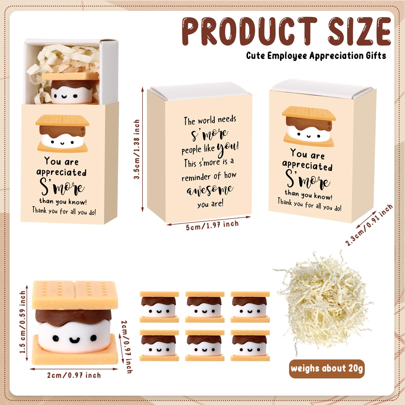 - You Are Appreciated Smore Thank You Gifts: the resin marshmallow sandwiches measure approximately 0.79 x 0.79 x 0.59 inch/ 2 x 2 x 1.5 cm, making them the cute little keepsake for recipients; The office colleagues gift boxes ideal for displaying the marshmallows in a neat and stylish way