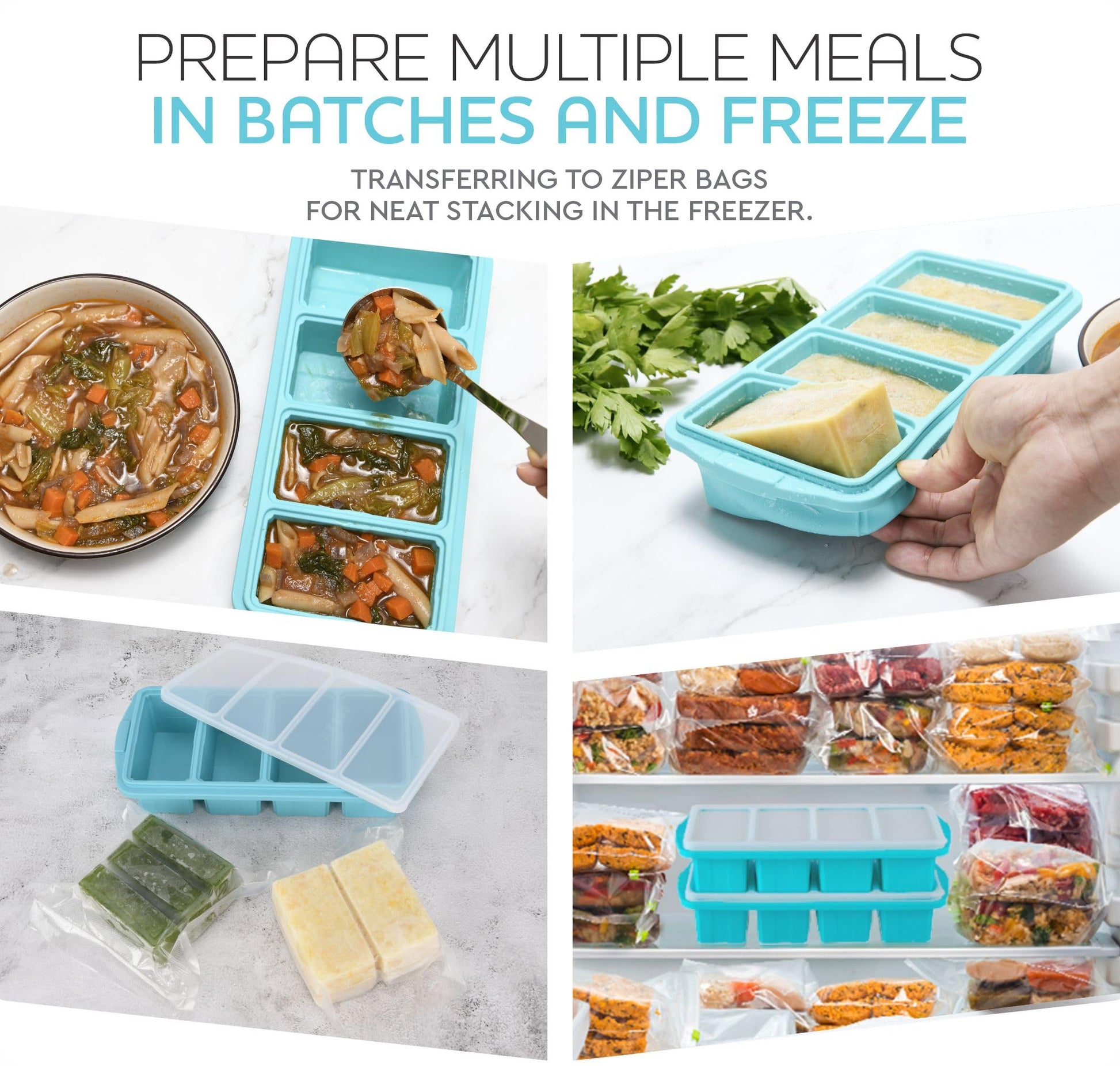 XOMOO Silicone Freezer Tray With Lid - Soup Freezer Container molds - Large Ice Cube Tray- makes 8 perfect 1 cup portions cubes, 2-Pack Freezer Storage Food Soups & Meal Prep - Oven & Dishwasher -Safe
