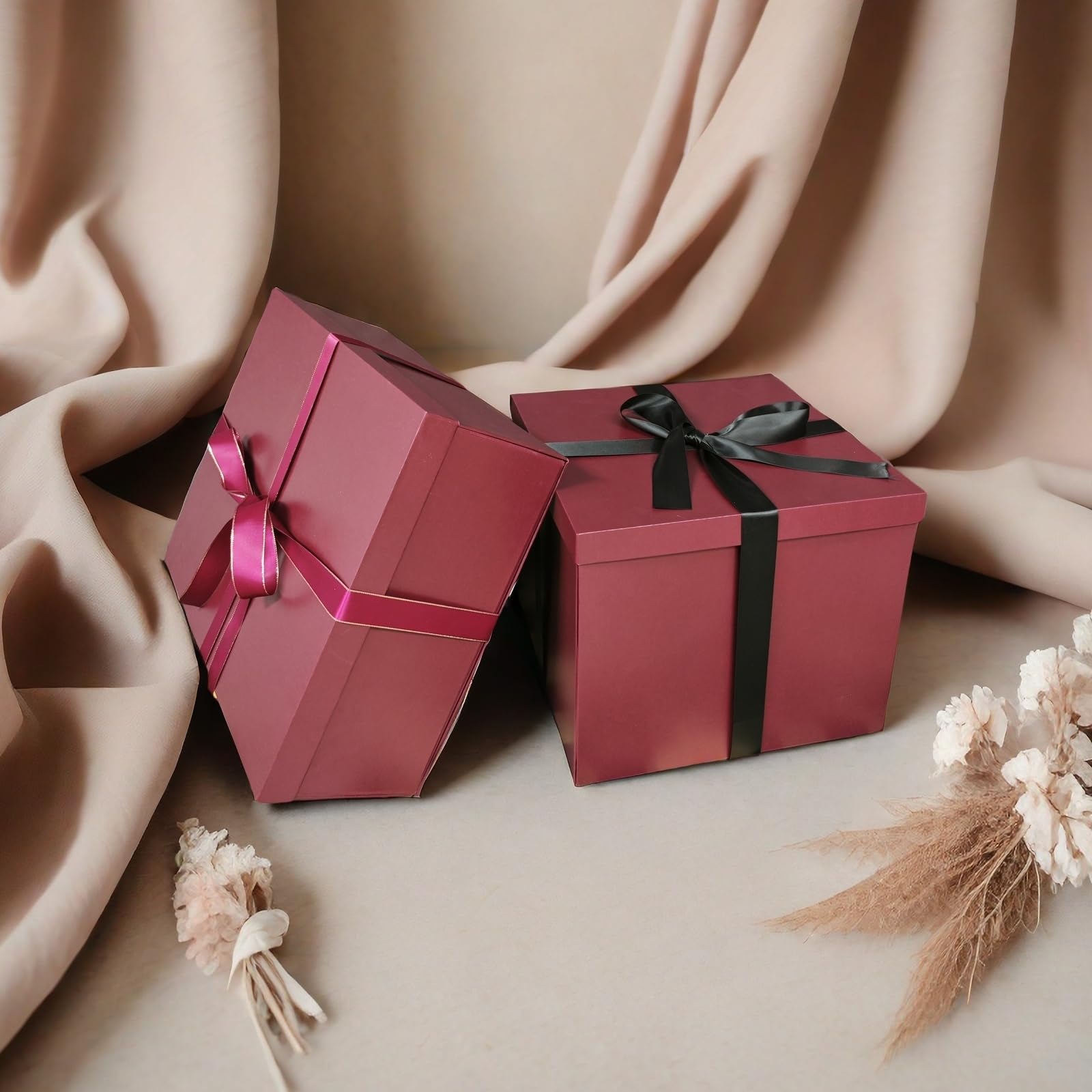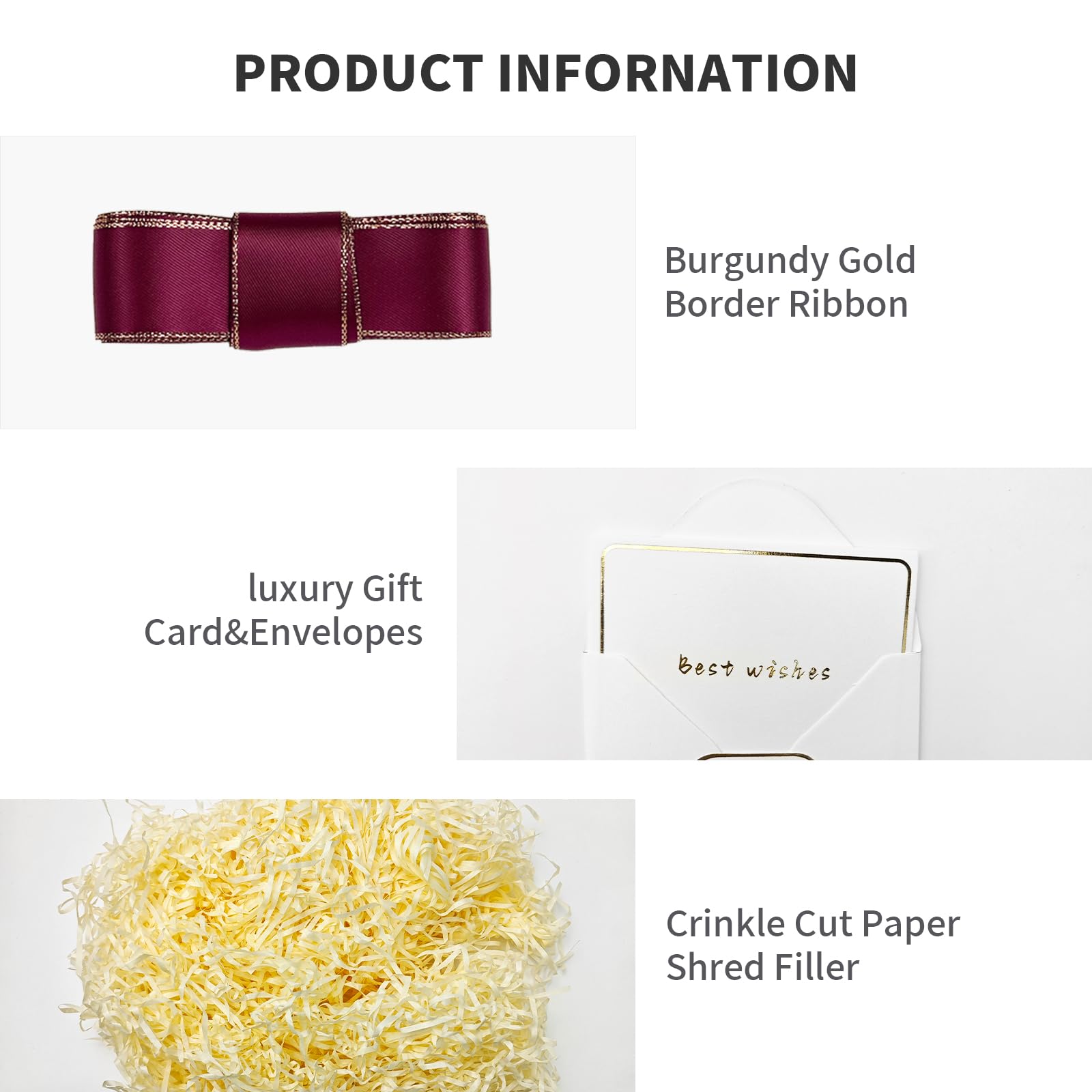 - Package Contains-1*Burgundy gift box,1*Gift Card&Envelopes,1Pack Shredded Paper Filler,118inch Luxury Ribbon.We Have Everything You Need.Please check the size whether it meet your needs or not before purchase.