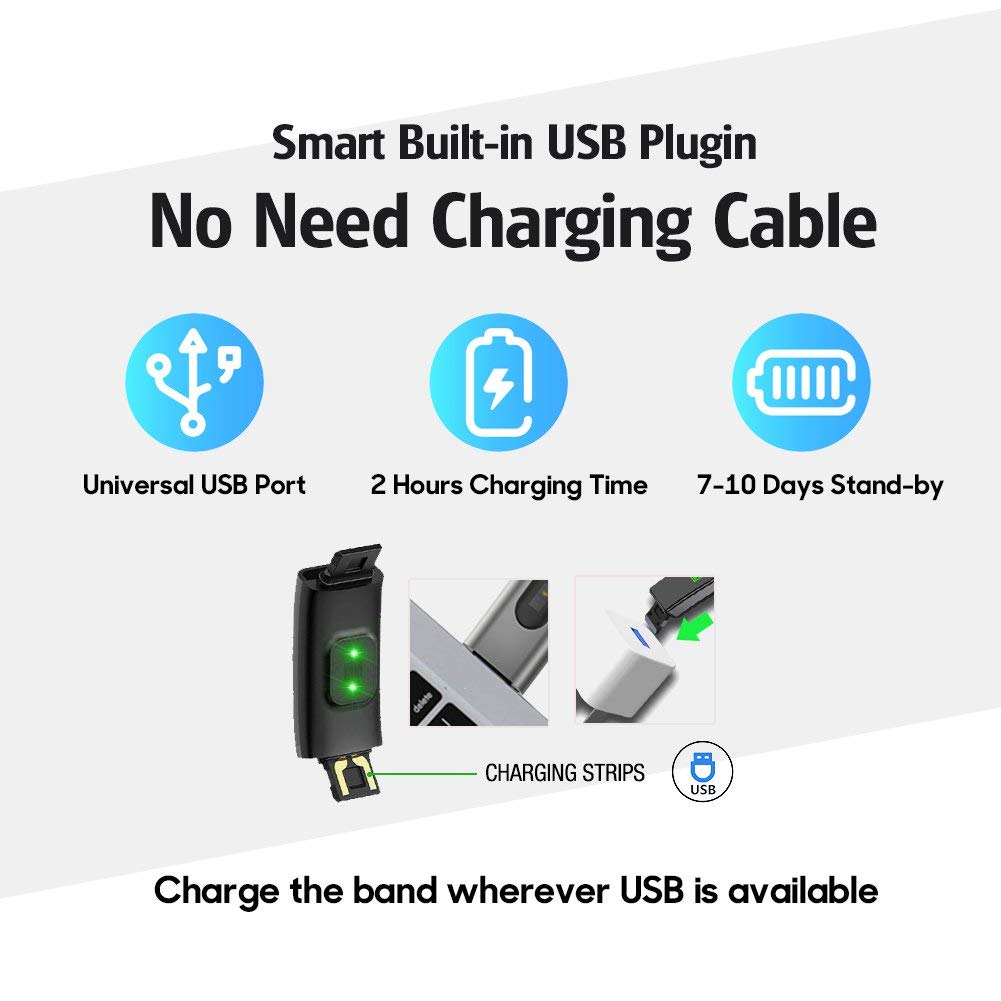 - Fast and Easy Charging: This fitness tracker is designed conveniently with a built-in USB plug and an impressive long battery life. A full charge of merely 1-2 hours can provide up to a whole week’s working time. Simply detach the band from the tracker host and charge it wherever there is a USB port, no need for any messy cables.